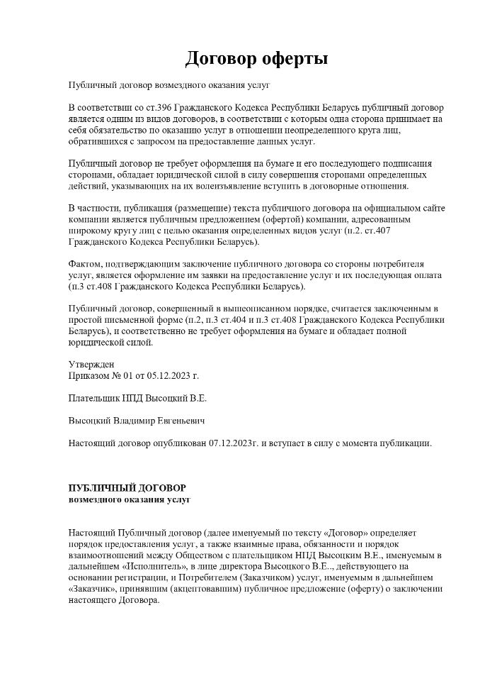 В частности, публикация (размещение) текста публичного договора на официальном сайте компании является публичным предложением (офертой) компании, адресованным широкому кругу лиц с целью оказания определенных видов услуг (п.2. ст.407 Гражданского Кодекса Республики Беларусь).